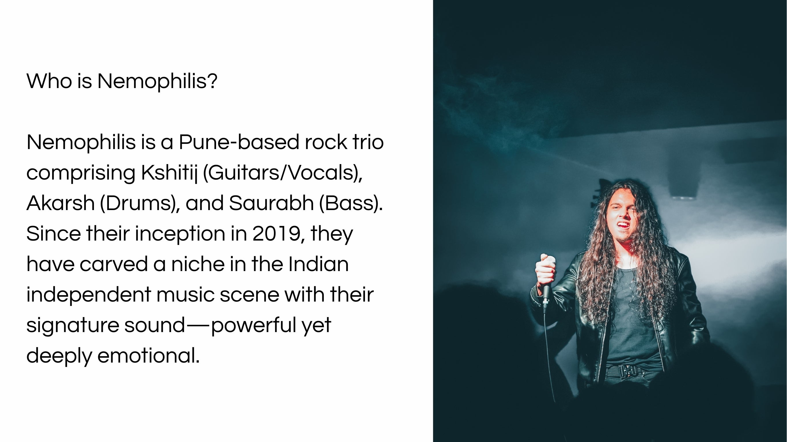 With a discography spanning 11 singles, a full-length album (The Iceberg), and multiple high-energy music videos, Nemophilis is known for their intense live performances and ability to seamlessly blend rock, alternative, and metal influences. Their ability to channel raw emotion into their music has earned them a loyal fanbase.